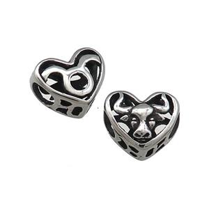 • Titanium Steel Heart Beads Zodiac Taurus Large Hole Hollow Antique Silver, approx 12mm, 4mm hole
