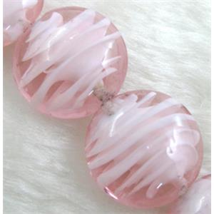 lampwork glass beads, flat-round, swirl line, pink, 20mm dia, 20pcs per st