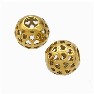 Titanium Steel Round Beads Large Hole Hollow Heart Gold Plated, approx 9-10mm, 4mm hole