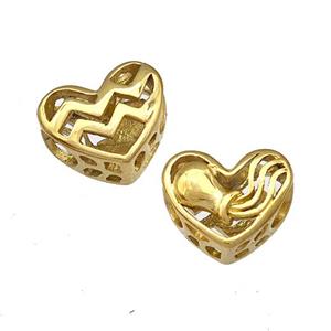 • Stainless Steel Heart Beads Zodiac Aquarius Large Hole Hollow Gold Plated, approx 12mm, 4mm hole