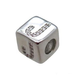 • copper cube letter-J beads pave zircon, platinum plated, approx 8x8mm