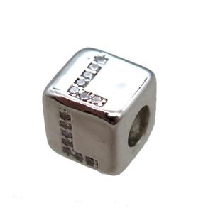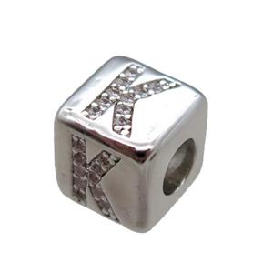 • copper cube letter-K beads pave zircon, platinum plated, approx 8x8mm