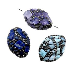 Clay Beads paved rhinestone with Larimar, oval, approx 18-28mm