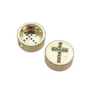 Copper Button Beads Pave Green Zircon Cross Gold Plated, approx 11mm dia