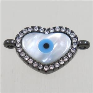copper heart connector paved zircon with shell evil eye, black plated, approx 10x12mm