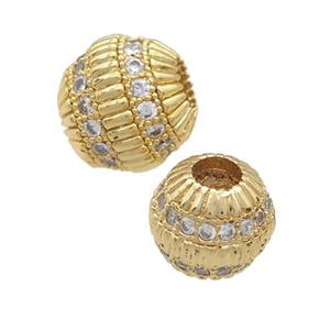 European style copper barrel beads paved zircon, gold plated, approx 9.5mm dia, 4mm hole