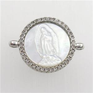 copper circle connector paved zircon with shell Jesus, platinum plated, approx 15mm dia