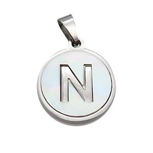 • Raw Stainless Steel Pendant Pave White Shell Letter-N, approx 15mm dia