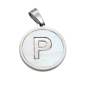 • Raw Stainless Steel Pendant Pave White Shell Letter-P, approx 15mm dia