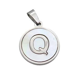 • Raw Stainless Steel Pendant Pave White Shell Letter-Q, approx 15mm dia