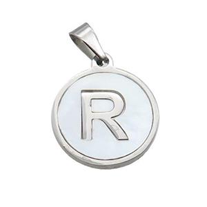 • Raw Stainless Steel Pendant Pave White Shell Letter-R, approx 15mm dia