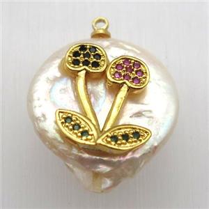 Natural pearl pendant with zircon, coconut tree, approx 16mm dia