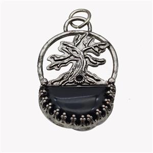 • Alloy Tree Pendant Pave Black Obsidian Moon Antique Silver, approx 26-35mm