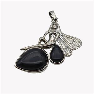Alloy Fairy Pendant Pave Black Obsidian Platinum Plated, approx 35-40mm