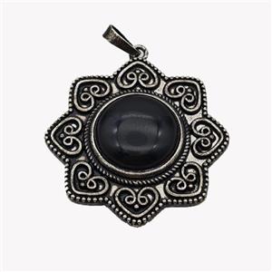 • Alloy Flower Pendant Pave Black Obsidian Antique Silver, approx 18mm, 40mm