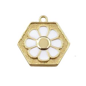• copper daisy pendant, hexagon, white enameling, gold plated, approx 17mm