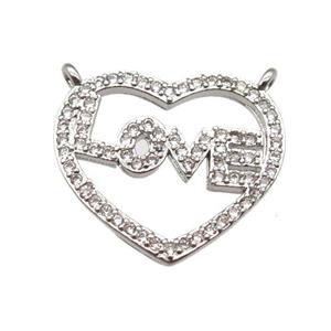 copper LOVE heart pendant paved zircon with 2loops, platinum plated, approx 16-18mm