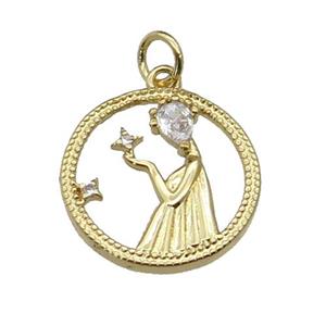 copper circle pendant pave zircon shell Angel gold plated, approx 16mm dia