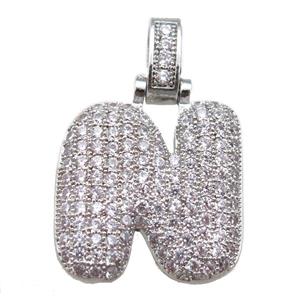 copper letter-N pendant paved zircon, platinum plated, approx 14-20mm