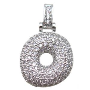 copper letter-O pendant paved zircon, platinum plated, approx 14-20mm