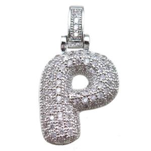 copper letter-P pendant paved zircon, platinum plated, approx 14-20mm