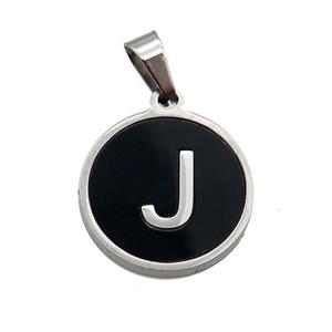 Raw Stainless Steel Pendant Pave Black Agate Letter-J, approx 15mm dia