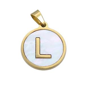 Stainless Steel Pendant Pave White Shell Letter-L Gold Plated, approx 15mm dia