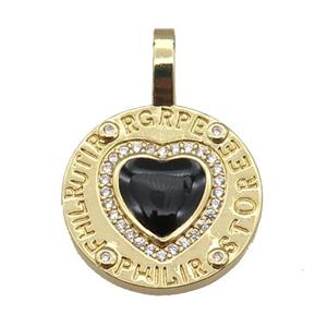 copper circle pendant paved zircon with black enamel heart, gold plated, approx 19-28mm