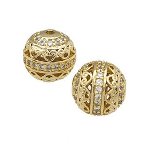 copper round beads pave zircon, hollow, gold plated, approx 9.5mm dia